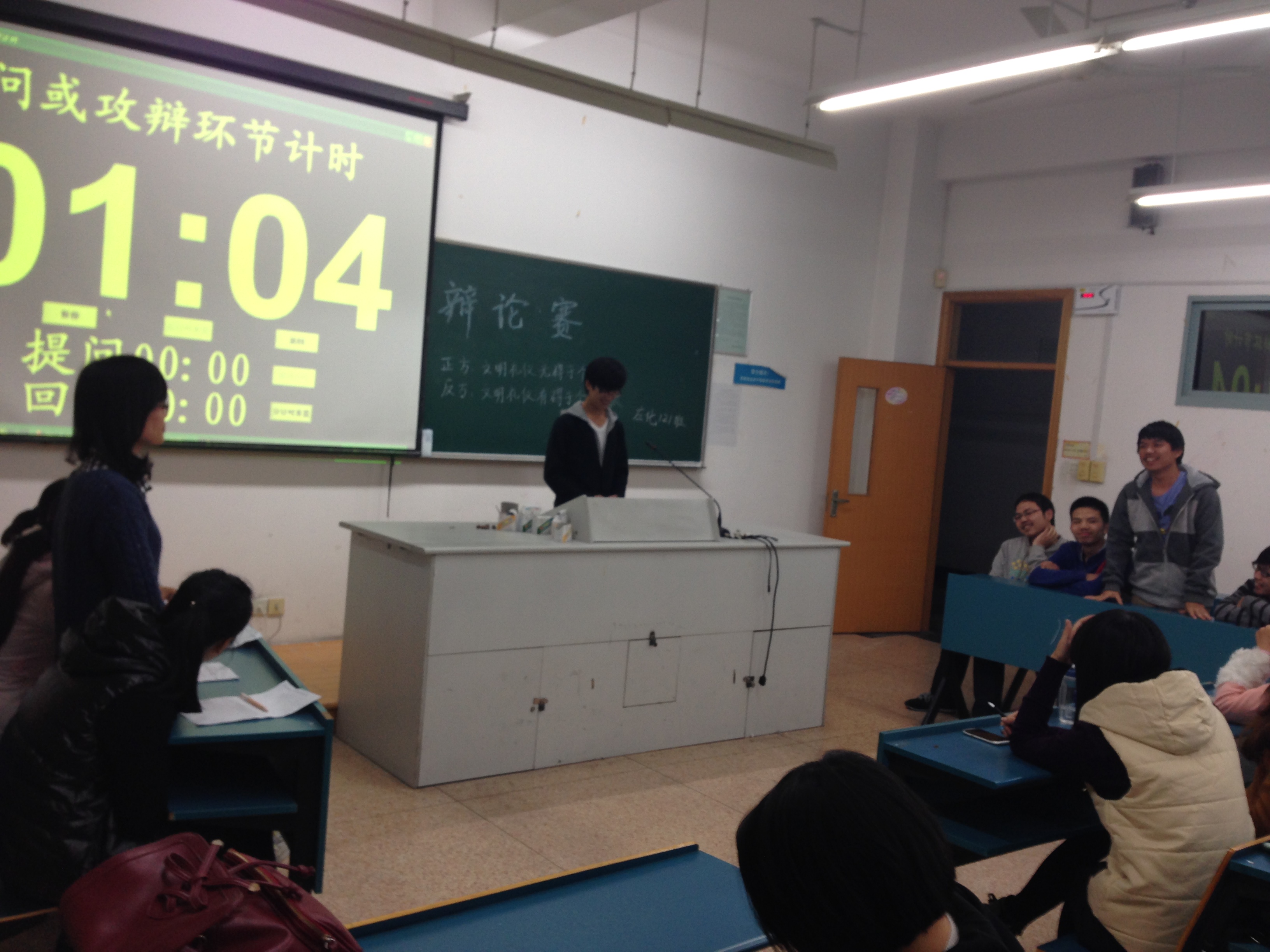 此次团日活动以辩论赛的形式热烈展开 ,其辩题为“文明礼仪的发展是否会阻碍个性的发展”。正方观点为不阻碍 ,而反方观点为阻碍。 该辩论赛以五个环节展开,分别为立论阶段、驳立论阶段、质辩环节、自由辩论和总结成词。在主席的主持下,辩论赛进行得如火如荼,正反方在语言的切磋中有了思想的交流, 触发了一种智慧的碰撞,可谓是唇枪舌战。最后正方凭借有力的辩词胜于反方,经评委席一致同意,夺得桂冠。而反方一辩也以卓越的思维和犀利的言语获得“最佳辩手”称号 。