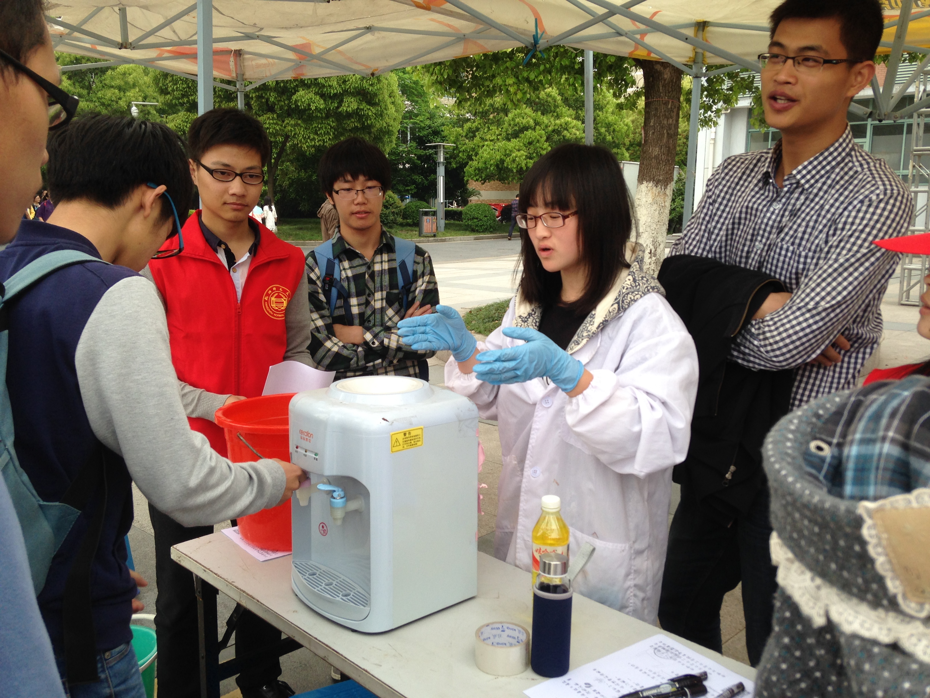材化青协工作人员带领着志愿者到各个寝室宣传,并且还在二期广场举办了免费清洗眼镜以及现场答题赢奖品活动,同时现场还设立清洗饮水机现场演示和现场报名点。通过观看工作人员现场清洗饮水机,前期的宣传受到很多寝室的热烈响应,很多寝室积极报名参加了寝室饮水机清洗活动。