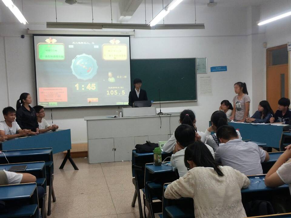 2014级“新生杯”辩论赛决赛在A楼414教举行。材化学院兼职辅导员陈周丽老师、生科院辩论队优秀辩手赵宏远、材化学院辩论队优秀辩手杨世伟担任本次比赛评委。历时半个月,经过两轮四场比赛的比拼,化学(师范)142班最终问鼎桂冠,高分子材料与工程141班获得亚军,高分子141班陈振贤获得“最佳辩手”称号。