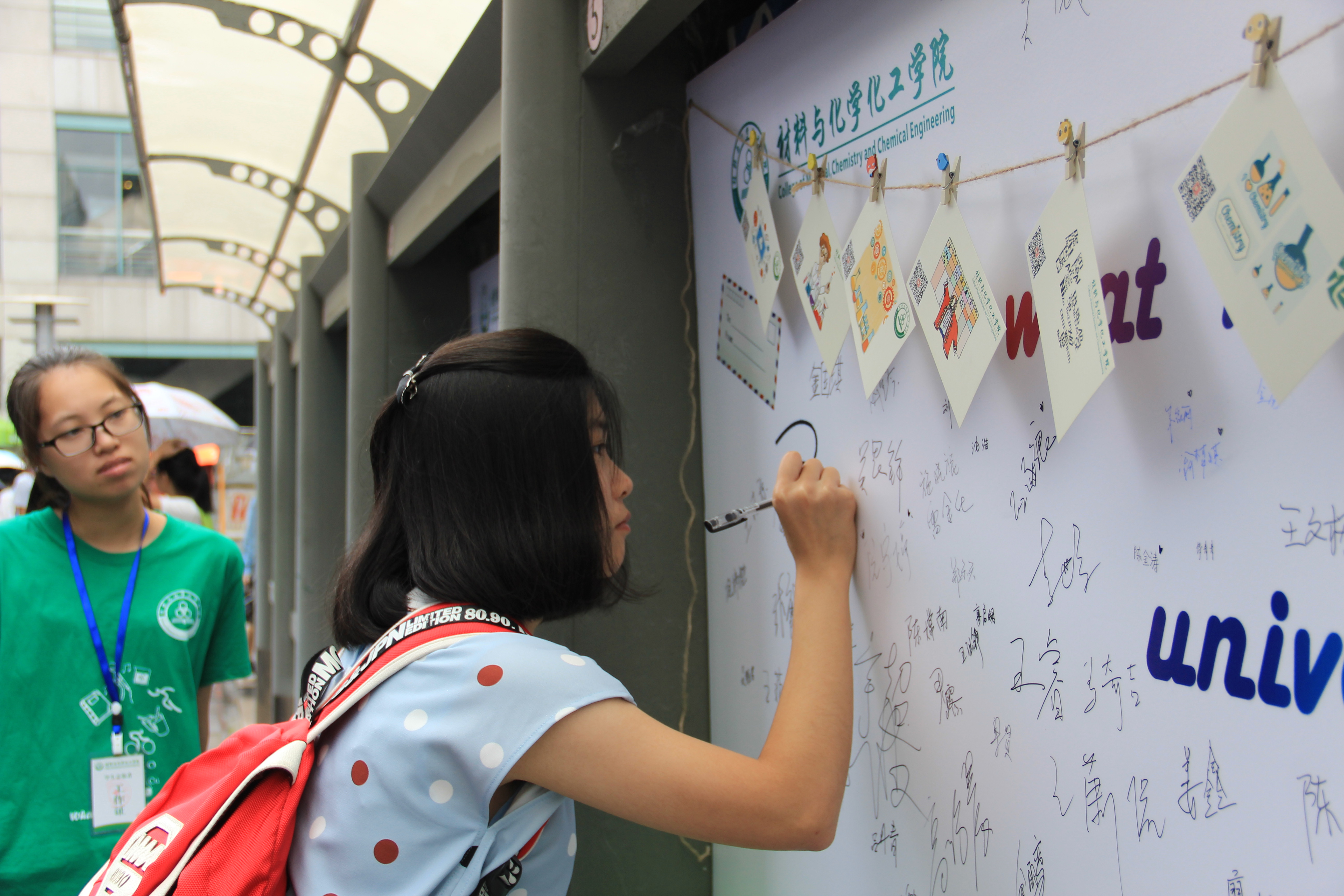 材化绿遍布学校大门、生活区正侧门、报道点、宣传栏、宿舍楼下,各位志愿者各司其职。有些志愿者帮助新生提拿行李,从学校大门到宿舍楼下来回十几趟也不喊累;有些志愿者在家长接待处与新生家长进行沟通,从各方面向他们介绍学院的情况;有些志愿者在海报栏前对学院丰富多彩的学习生活进行宣传,并引导新生在学院海报前留下了他们的签名与合影。