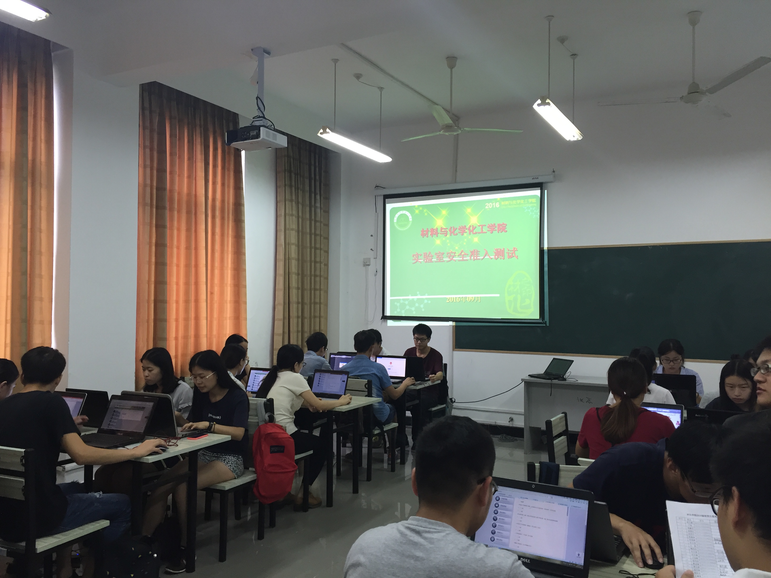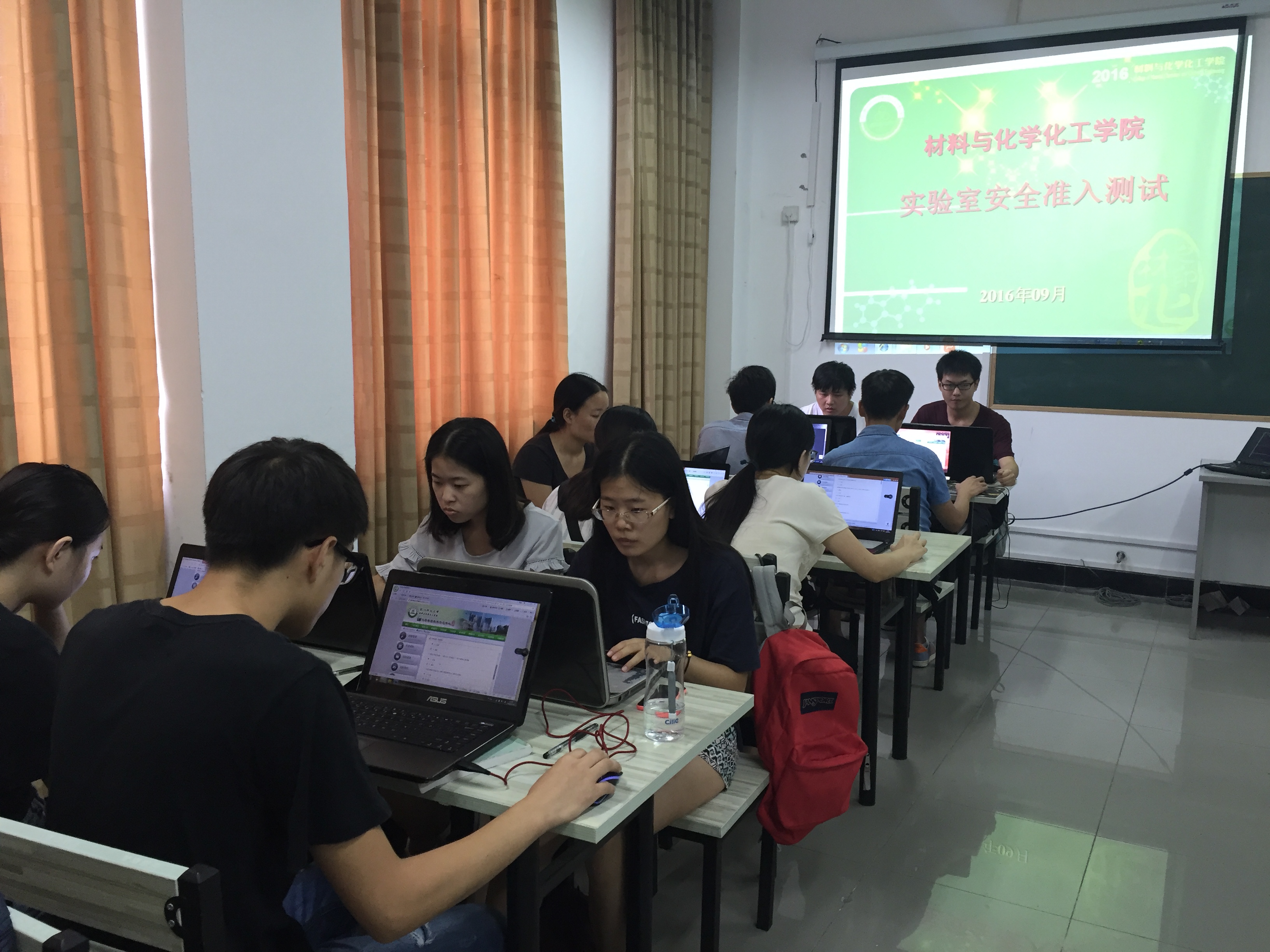 9月28日下午,材化学院2016级研究生新生在D楼402进行实验室安全准入测试,研一同学认真学习实验室的安全知识与操作规范,并对所学到的实验室操作规范与安全知识进行了网上测验。