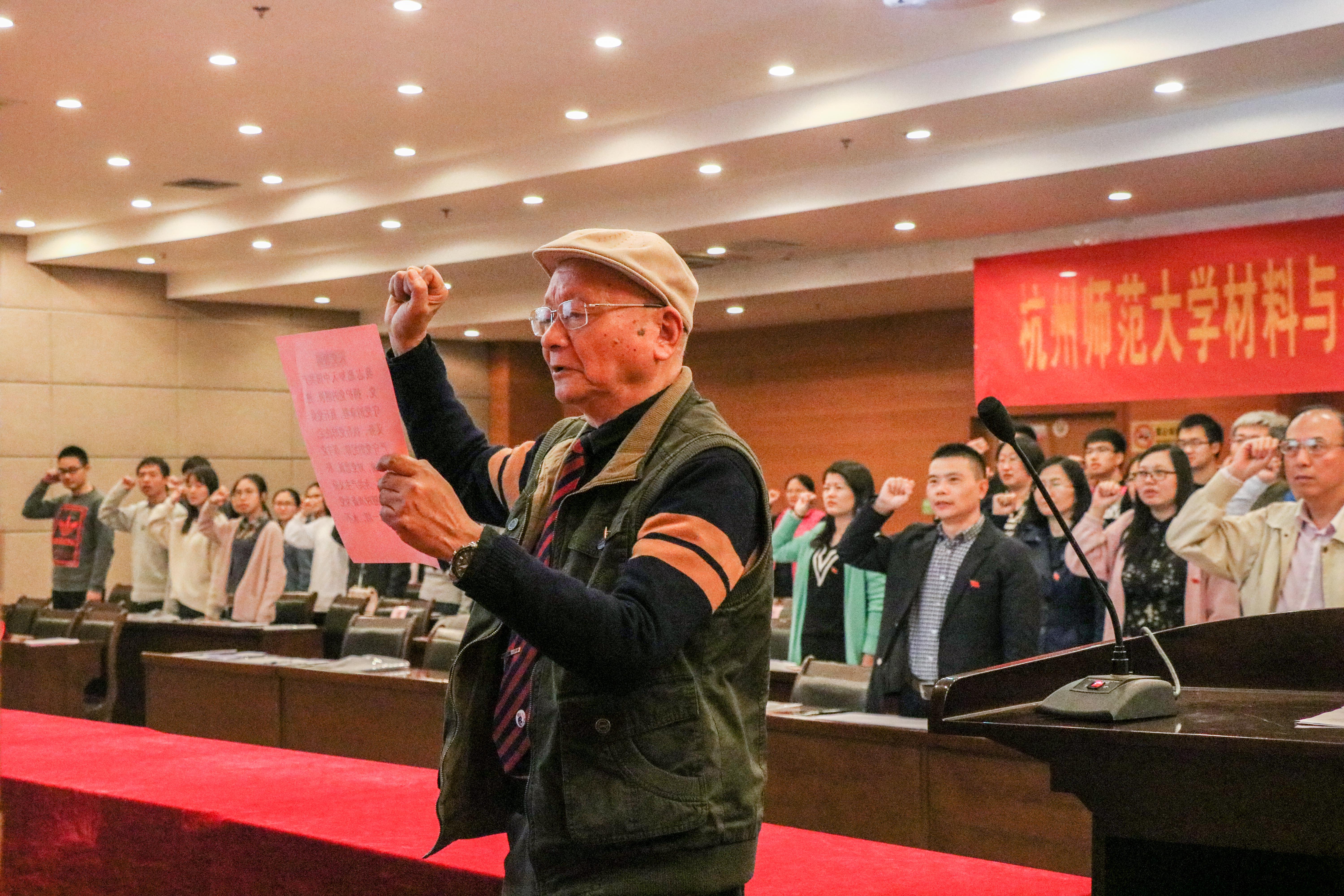 大会上,罗来庚书记代表学院党委向党龄超过50年的党员代表周宁怀教师颁发纪念章,张良、沈聪同学代表全体新党员献花,全场掌声雷动,气氛热烈。随后,周宁怀老师带领全体党员师生重温入党誓词,并进行庄严宣誓。