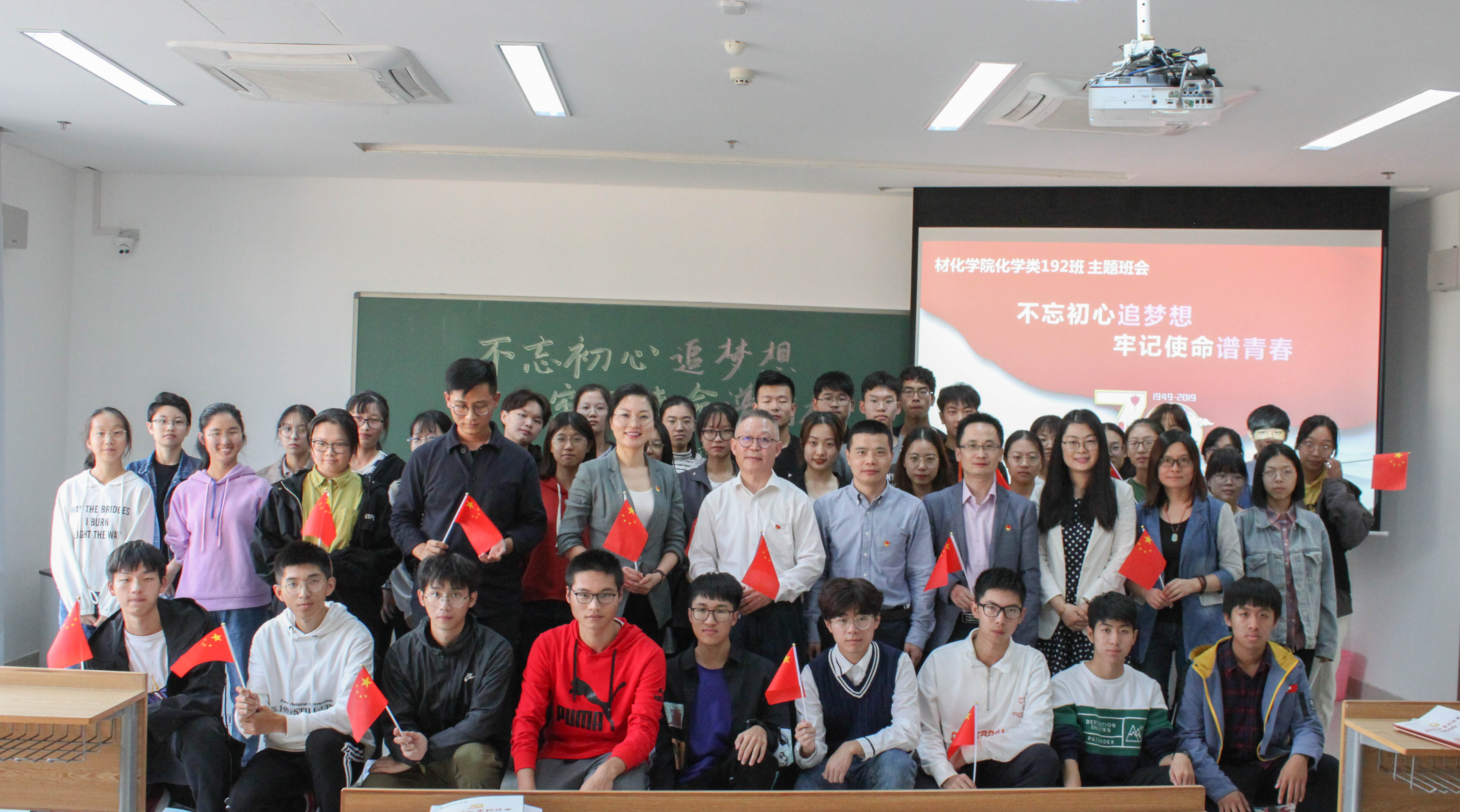 班会在同学们齐声合唱《歌唱祖国》中开始,悠扬深情的旋律使同学们沉浸在祖国的雄伟壮丽中。带着对祖国的崇敬,班长张雯彦同学汇报展示了新中国建国七十年以来党领导全国各族人民团结共进的光辉历程。建国、土地革命、改革开放、港澳回归,一幅幅旧画面重新展开,将历史轻轻诉说,帮助着同学们进一步了解党的初心与使命。随后,四位同学代表与众人分享了他们所认为的“初心与使命”,激起了在场同学的共鸣。随着气氛越发融洽,班会进入了爱国歌曲竞猜环节。歌曲刚一响起,与会成员便纷纷积极竞答,当下热门的歌曲更是引起了全场的大合唱,现场的气氛逐渐热烈起来。而几位获奖的幸运儿还主动和同学们分享了自己的大学规划。接着校党委委员、统战部部长袁成毅教授向同学们介绍了校史校情和办学初心,并表达了对同学们的希冀,与全体师生留下合影。