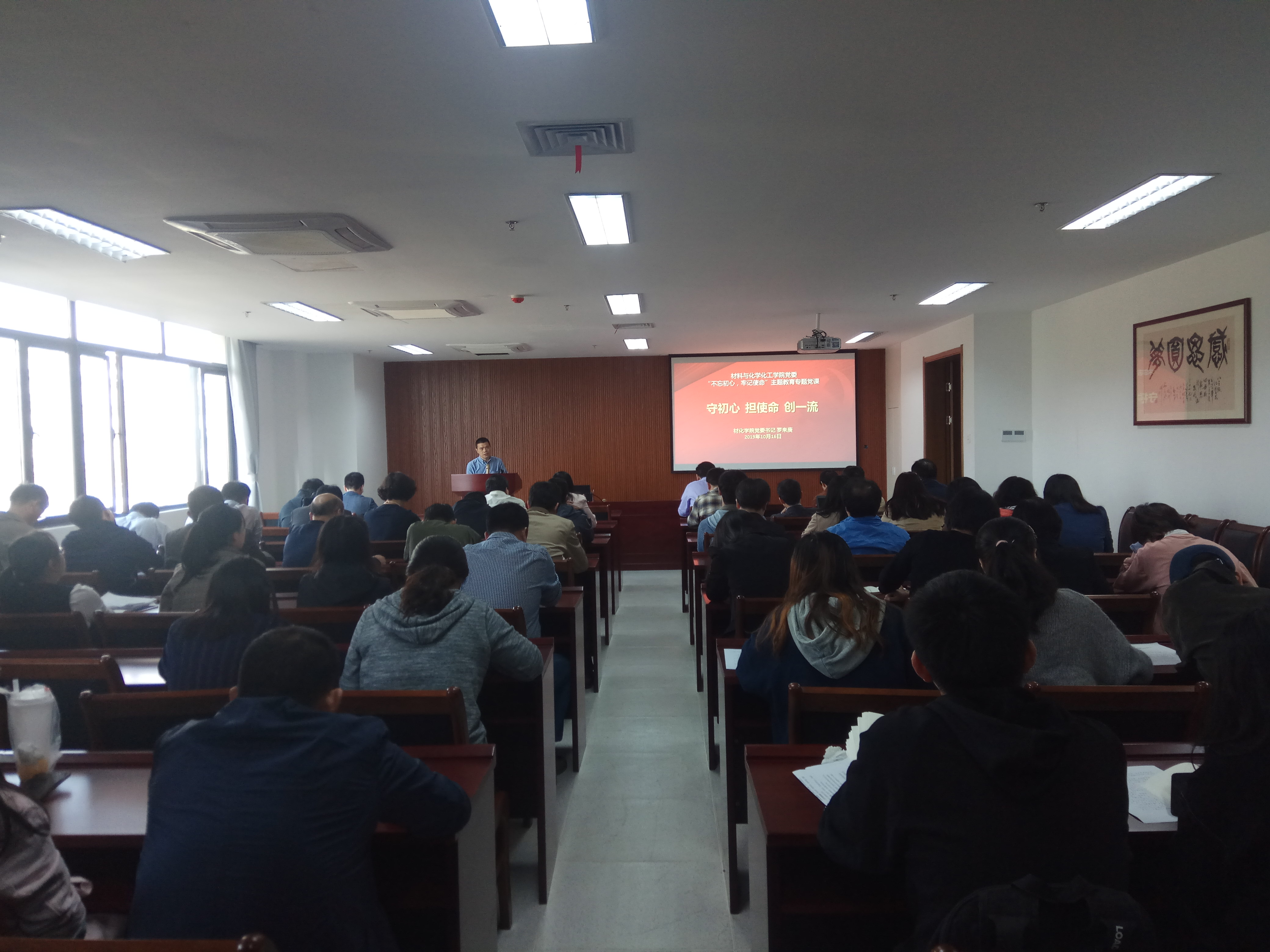 10月16日下午,材化学院“不忘初心、牢记使命”主题教育专题党课在勤园17号楼210会议室举行。院党委书记罗来庚、院长章鹏飞分别上了专题党课,全院教职工、学生党员参加了党课学习。