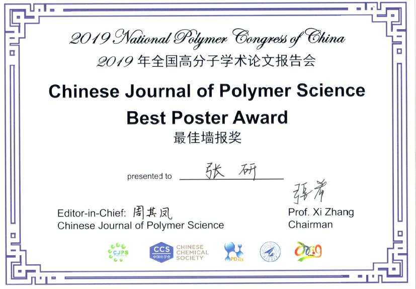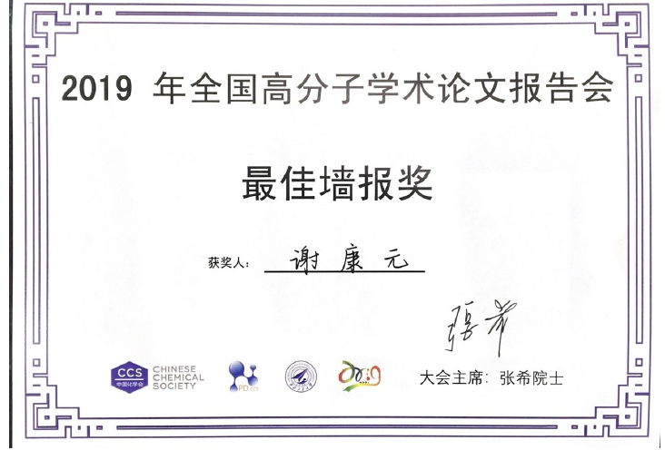 在此次会议中,高分子工程与物理团队李勇进教授任“高分子加工分会”共同主席并作邀请报告,由吉春教授、王莲副教授做了精彩的口头报告,多名研究生同学进行了墙报展示。在大会进行的优秀墙报评审中,谢康元同学获得大会优秀墙报奖,张研同学获得Chinese Journal of Polymer Science 冠名优秀墙报奖。据悉,本次会议优秀墙报奖的比例为5%,而冠名墙报奖的比例仅为1%。在闭幕式上,张希院士、颜德岳院士、杨万泰院士、黄维院士在闭幕式上为优秀墙报获得者颁发了荣誉证书。这是该团队研究生连续第四次获得全国高分子学术论文报告会优秀墙报奖。在过去四届高分子学术论文报告会中,团队共有研究生9人次获得优秀墙报奖,说明高分子工程与物理团队的研究生培养得到全国同行的认可。