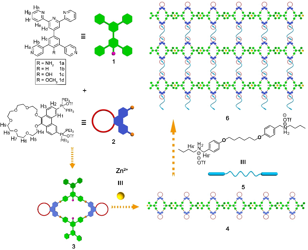 超分子聚合物以非共价键力作为连接桥梁,将超分子的动态可逆性能引入到聚合物体系当中,赋予了聚合物材料优异的环境刺激响应性,构建了功能繁多的新型智能材料通过金属配位相互作用可以预设计构建明确几何结构的金属大环化合物,并且过渡态金属自身所具有的特性以及金属配位键之间电荷传递所引起的性质调控等可赋予所形成化合物在包裹与释放、催化、光电材料等方面的应用论文中,作者首先利用Pt(II)-吡啶配位驱动自组装的提供的一级作用力高效合成了一系列三联吡啶和冠醚修饰的菱形金属大环;其次,作者利用Zn-三联吡啶配位作用力形成线性超分子聚合物;最后,作者利用金属大环上的冠醚与二级铵盐之间的主客体相互作用形成双金属交联超分子聚合物。这三种作用力互不干扰。该交联超分子聚合物在高浓度时可以形成凝胶,其具有热、K+等多重刺激响应性,以及良好的自修复性能。此外,通过改变改变金属大环中吡啶配体的官能团的给电子能力,超分子聚合物发光的性能可实现有效地调控。