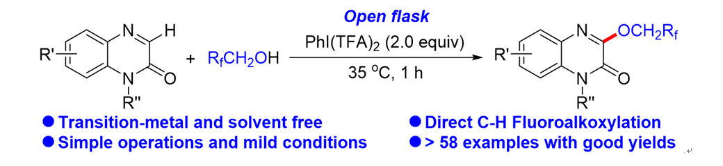 材化学院章鹏飞课题组李万梅老师为通讯作者,于2019年发表于Org.Lett.(中科院一区)的研究论文“Transition-Metal and Solvent Free Oxidative C-H Fluoroalkoxylation of Quinoxalinones with Fluoroalkyl Alcohols”入选ESI高被引论文。论文探索了C-氟烷氧基化的成键机制和成键规律,为含氟有机化合物的制备提供了新的合成方法。含氟化合物因结构独特、性能优异而广泛存在于药物、特种材料和其他精细化学品中,通用的制备方法是采用氟化氢取代氯碳键而得,存在巨大的健康和生态风险,该领域已成为化学化工研究领域的热点。论文首次研究了无过渡金属和溶剂参与下的喹喔啉酮与氟烷醇的氧化C-H活化-氟烷氧基化,探讨了惰性C-H的断键与氟氧烷基C-O键的形成机制,为组胺-4受体拮抗剂的制备提供了原子经济、选择性好且高效的合成路线。