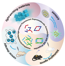 本文同时也指出开发新型荧光超分子组装体以供实际应用方面仍然面临着很大的挑战。荧光超分子组装体仍然需要在(i)构建水溶性荧光超分子组装体作为新的药物载体和递送剂;(ii)设计和制备新型软材料来提高组装体的刺激响应性、自愈性、适应性和可循环能力等特征;(iii)探索刺激响应性和复杂的荧光超分子组装体来模拟生物系统的功能和特性等方面进一步深入充分进行探索。针对荧光超分子组装体实际应用中存在的挑战,本文提供了一些解决方案:(i)通过将传统聚合物引入含AIE荧光团的金属环/笼的荧光超分子组装体中可以有效提高荧光超分子组装体的力学性能;(ii)将新的功能元素或基团(如金属离子、二硫键或金属配位键)引入到荧光超分子组装体的金属环/笼的内在空腔,通过多级自组装来构建复杂的超分子材料,可以赋予或调节荧光超分子组装体的功能;(iii)通过改变配体或摩尔比来调节超分子配位复合物的分子结构,可以发展具有不同拓扑结构(如分枝、超支、树枝状、星形和交联结构)的荧光超分子组装体。