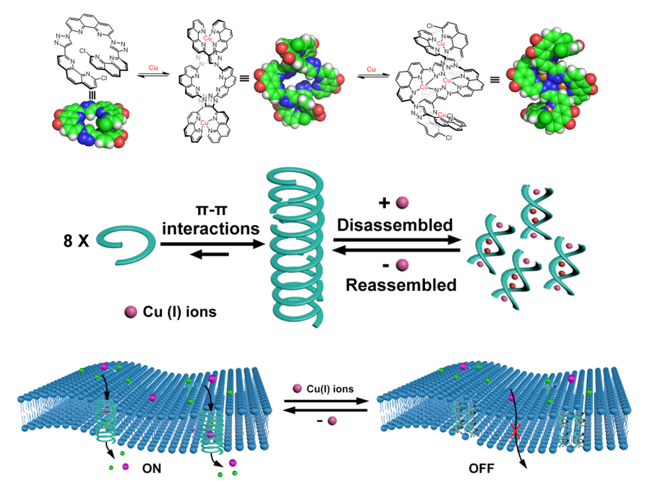 天然离子通道通过对外界刺激的响应实现离子可控、高效、选择性地穿过细胞膜产生化学信号或电信号,从而调节多种生理现象,影响细胞生命。然而,利用化学合成体系来构建人工离子通道并复制天然离子通道的功能仍面临巨大挑战。受天然KcsA K+通道的启发,团队精确设计了具有铜离子调控含孔道单螺旋和无孔道双螺旋互变行为的芳香螺旋寡聚物,利用具孔道单螺旋自发形成的一维自组装螺旋管,该结构通过晶体衍射获得证明。将该通道嵌入磷脂双分子层,则展现了高效、稳定的离子通道性能。随后,通过铜离子配位与去配位诱导单双螺旋结构互变进而导致的自组装螺旋管的解组装和重新组装,实现了所设计离子通道的可逆关闭与打开。该工作首次利用单双螺旋结构互变,构建了第一例原位配体门控的可逆仿生离子通道,研究结果对于理解天然离子通道的行为机制具有重要的生物学意义,也为开发在生物学和医药学领域具有潜在应用的智能仿生纳米通道提供了全新的思路。