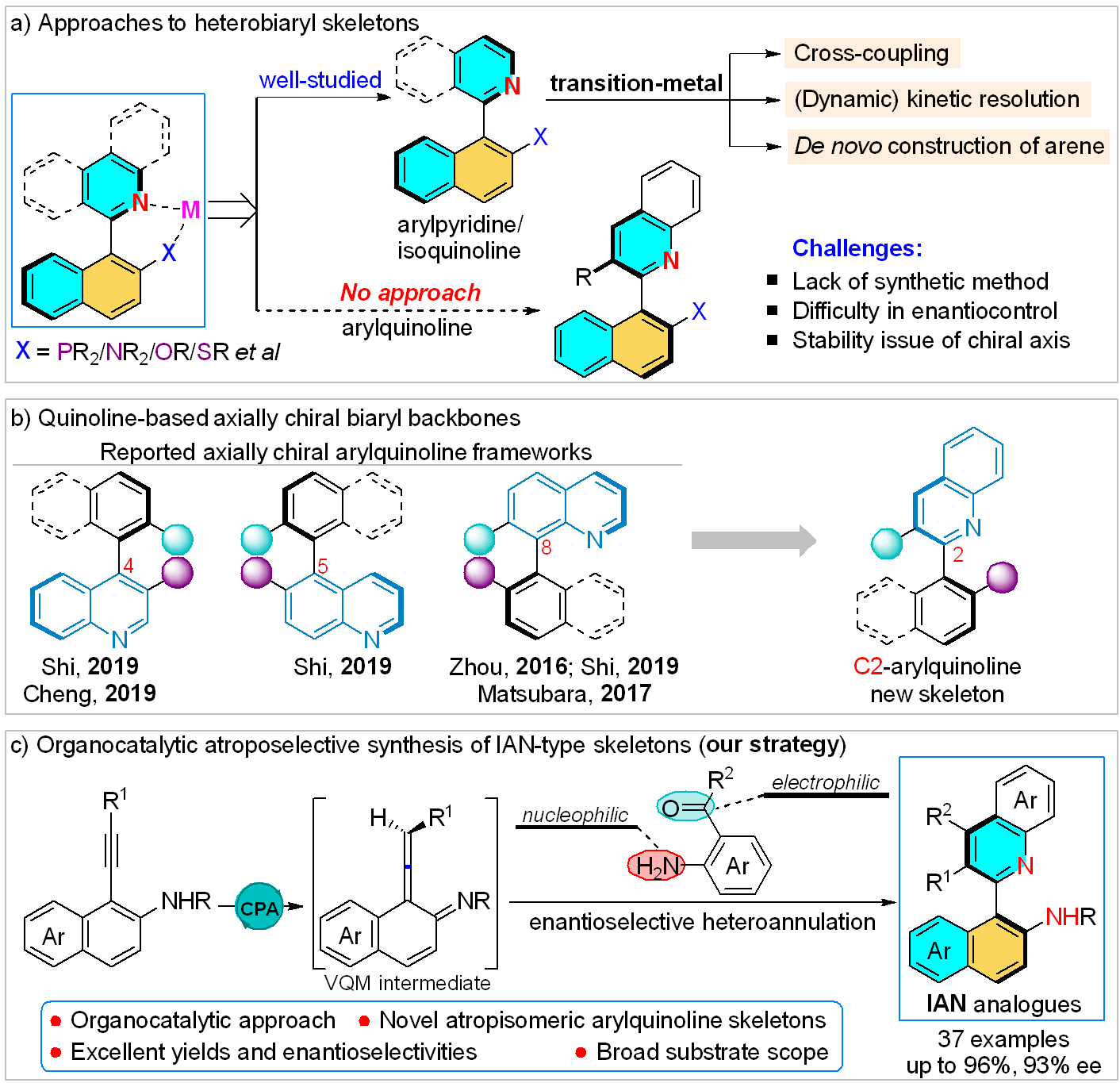 目前,针对轴手性化学的研究越来越受到化学工作者们的青睐,特别是基于联苯及联萘型两类联芳基轴手性化合物的不对称构建,已有大量文献报道。然而, 与之形成鲜明对比的是,含吡啶、异喹啉等芳杂环的轴手性骨架的催化不对称构建却发展缓慢,是该研究领域亟待解决的难题。