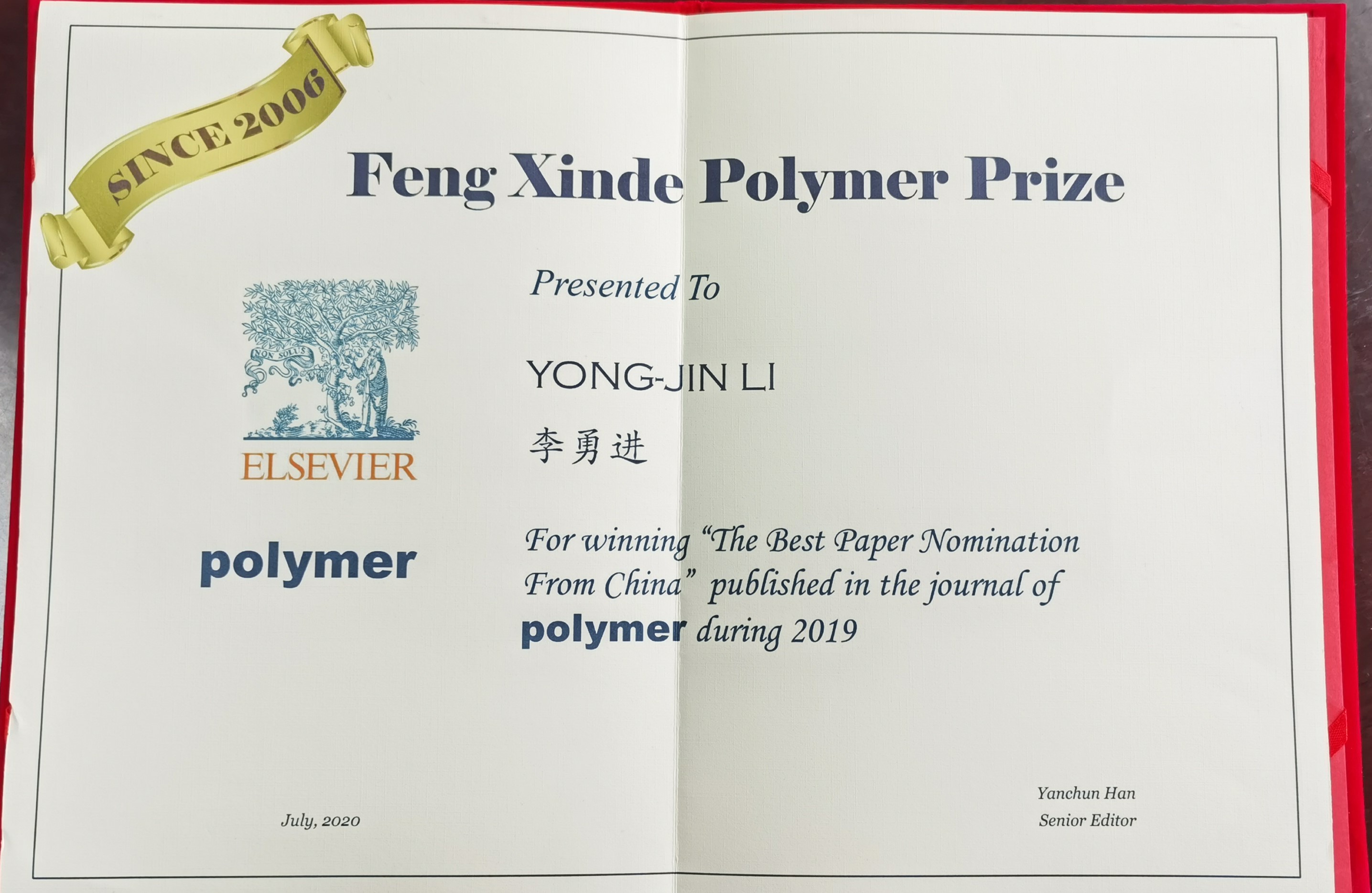 本次奖项由POLYMER期刊亚洲区资深编辑、主编及POLYMER期刊华裔编委组成评审委员会,经过公正严格的评阅,最终从全年300多篇论文中评出本年度“冯新德高分子奖”最佳文章奖1篇和最佳文章提名奖9篇。李勇进教授获得最佳文章提名奖。论文第一作者为本校2020年毕业硕士研究生杨鑫。值得一提的是,这是李勇进教授继2018年获得第十二届冯新德高分子奖以来第二次获此殊荣。