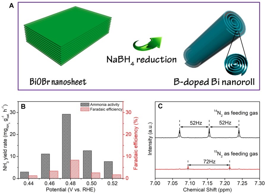 有鉴于此,该团队设计了一种新型光电化学固氮方法,利用光阳极半导体产生的光生电子驱动阴极的N2还原反应。该设计可以高效利用太阳能用来合成氨,且该反应是在常温常压条件下进行,解决了现有Haber法高耗能、高污染问题。该团队发现,层状溴氧铋在强还原剂(NaBH4)作用下,溴氧铋单层拓扑转化成Bi纳米卷并实现原位B元素掺杂。将该催化剂用于氨合成光阴极,在0.05 M H2SO4溶液和0.48 V的偏压下,氨生成速率是29.2 mgNH3 gcat.-1 h-1,法拉第效率达到了8.3%。结合理论计算发现,B元素的掺杂显著降低了铋催化剂氮还原的决速步N2 → *NNH的活化能。同时,卷曲结构促进了N2分子在催化剂表面的吸附、活化并抑制了竞争性的氢析出反应,提高了整个催化剂固氮的活性和法拉第效率。该工作为今后光电化学固氮催化剂的设计提供了一种新的思路。