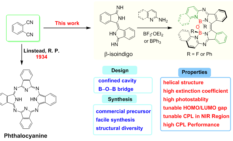 近期,针对上述难题,中文成人小说 卢华课题组设计合成了一系列基于-异靛蓝骨架的B-O-B桥联Aza-BODIPY类似物(BIABs)。二亚氨基-β-异靛蓝与异芳胺缩合反应产生限域配体腔,限制在配体腔中的两个相邻BF2或BPh2单元随后通过自发水解生成B–O–B桥。β-异靛蓝单元和B–O–B受限腔中的位阻产生满足螺旋性要求的扭曲构象,从而获得了优异的光谱和光学活性性质,如高摩尔吸光度、优异的光稳定性、近红外发光和强手性光学响应等。理论计算显示,由于B-O-B桥联螺旋结构和π扩展共轭增强了跃迁磁偶极距|m|,获得了发光在近红外区域可调且具有高glum (1.3 × 10−3)和高BCPL (11.5 M−1 cm−1)的有机分子材料。该合成方法简洁、起始原料为邻苯二腈,这也是广泛研究的功能分子酞菁的前驱体,因此,此方法为丰富近红外螺旋烯类化合物提供了新策略,为手性调控提供更多的灵活性。