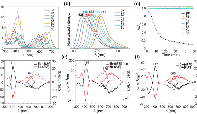 图2. BIABs在二氯甲烷中的光谱性质。a)吸收,b)发射光谱,c)光稳定性,d-f) 5a、5b和6a的ECD和CPL光谱。