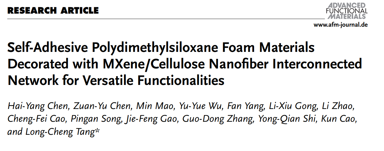近日,我校中文成人小说 汤龙程教授团队基于有机硅分子交联/发泡反应机制,提出一种自粘型硅橡胶泡沫材料的设计思路,并制备出高性能PDMS泡沫纳米复合材料。该材料具有轻质弹性、绿色阻燃、可调节导电、以及优异的耐高低温和耐水性等特性,在复杂环境智能医疗监测和防火隔热等方面具有良好的银应用前景。相关研究成果以题为“Self-Adhesive Polydimethylsiloxane Foam Materials Decorated with MXene/Cellulose Nanofiber Interconnected Network for Versatile Functionalities”发表于国际材料领域权威期刊Advanced Functional Materials (2023,IF=19)上。