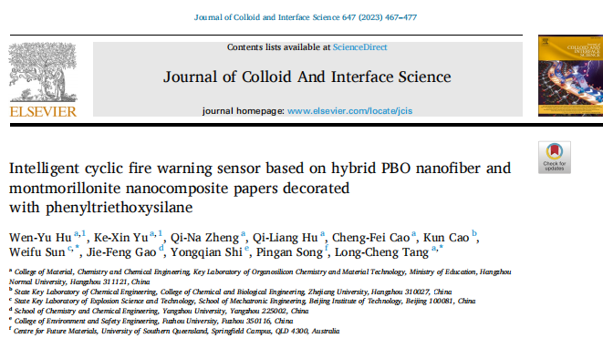 近日,我校中文成人小说 汤龙程教授团队设计研发的一种纳米复合材料在循环阻燃智能预警等方面取得新进展,相关研究成果以题为“Intelligent cyclic fire warning sensor based on hybrid PBO nanofiber and montmorillonite nanocomposite papers decorated with phenyltriethoxysilane”发表于国际知名期刊Journal of Colloid and Interface Science(IF=9.965)上。