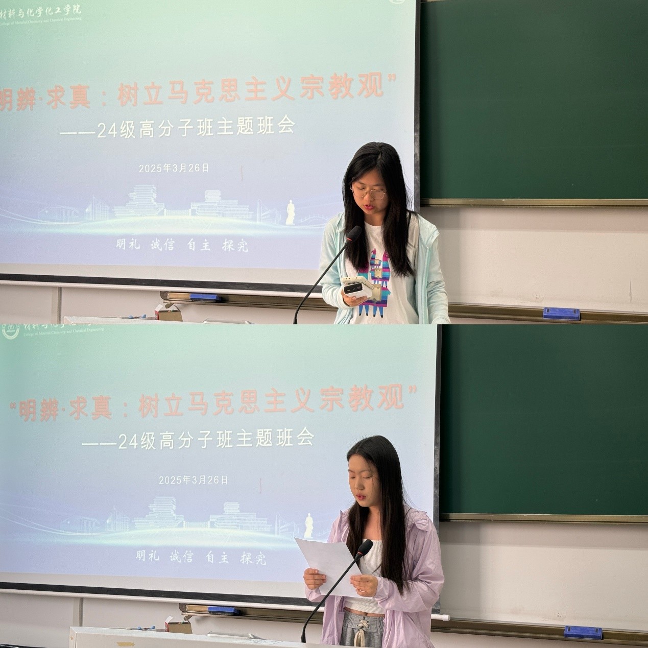 3月26日上午,24级高分子班以“明辨·求真:树立马克思主义宗教观”为主题举行了一场别开生面的主题班会,旨在引领同学们如何正确认识马克思主义宗教观,了解党的民宗政策。中文成人小说 党委书记来国灿作为班级结对领导参加本次主题班会并发表讲话。学院党委副书记管庆江、辅导员赖雷雨参加班会。